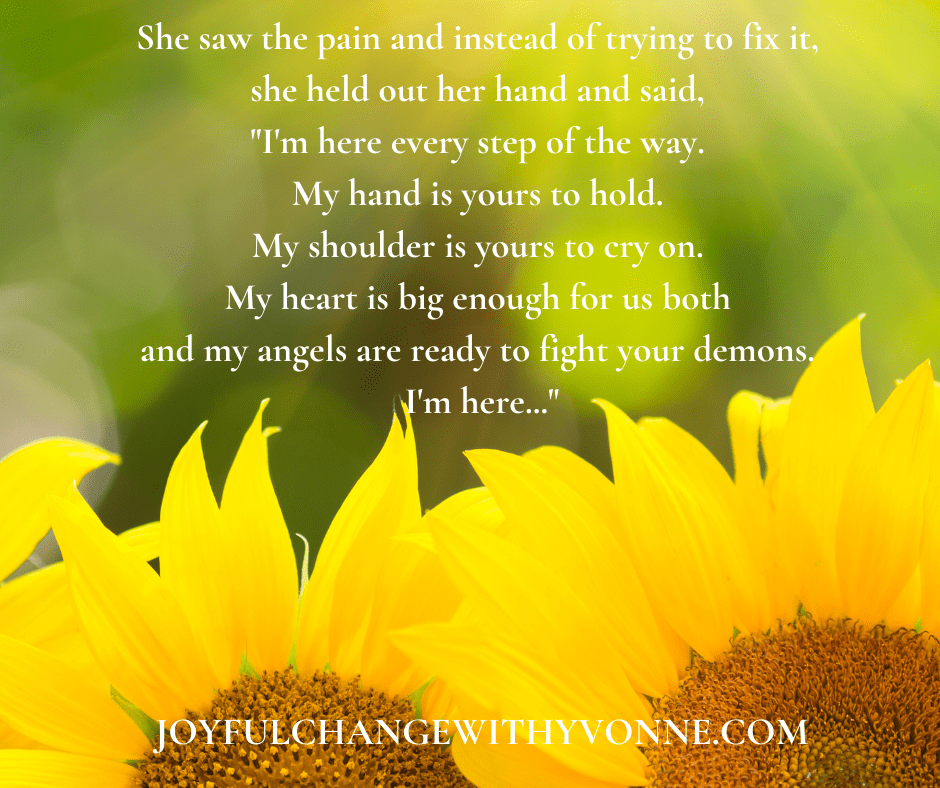 She saw the pain and instead of trying to fix it, she held out her hand and said, “I’m here every step of the way. My hand is yours to hold. My shoulder is yours to cry on. My heart is big enough for us both and my angels are ready to fight your demons. I’m here…”