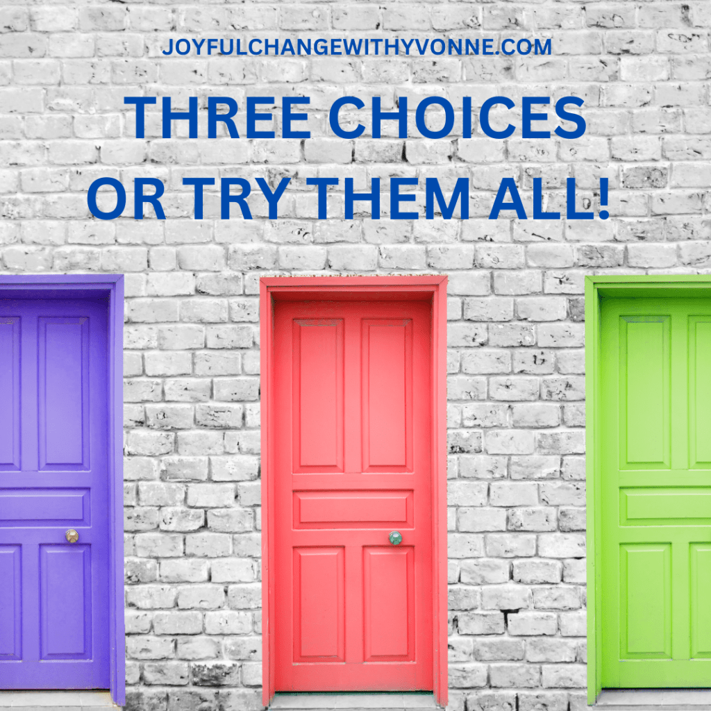 Sometimes I’m all over the place. I know that. It can be confusing. So, here are the three choices and they’re not set in stone by the way. They can mix and match – as I wrote before in Customized-Life-Coaching because I’m not a ‘normal’ life coach! I’m unconventional, I guess you’d say!