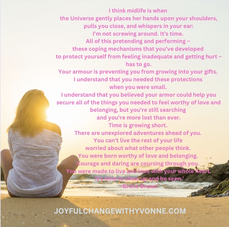 “I think midlife is when the Universe gently places her hands upon your shoulders, pulls you close, and whispers in your ear: I’m not screwing around. It’s time. All of this pretending and performing – these coping mechanisms that you’ve developed to protect yourself from feeling inadequate and getting hurt – has to go. Your armour is preventing you from growing into your gifts. I understand that you needed these protections when you were small. I understand that you believed your armor could help you secure all of the things you needed to feel worthy of love and belonging, but you’re still searching and you’re more lost than ever. Time is growing short. There are unexplored adventures ahead of you. You can’t live the rest of your life worried about what other people think. You were born worthy of love and belonging. Courage and daring are coursing through you. You were made to live and love with your whole heart. It’s time to show up and be seen.”