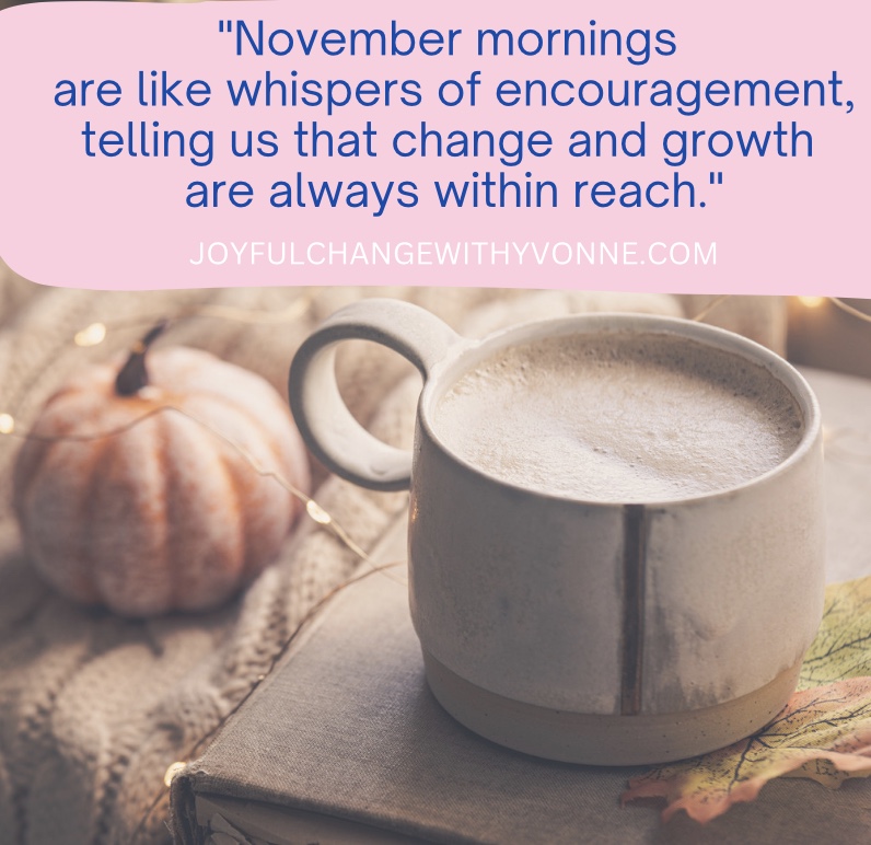There is something so inviting about November mornings. Similar to September mornings when the school year begins, I find there’s a spring in the step when November rolls around! There’s a magic in the air, a fresh look at the ending of the year and the entrance to the holiday season! There’s a sense of encouragement, a whispering voice that urges one to ‘go for it and see what happens’ when we’re not sure what to do next.