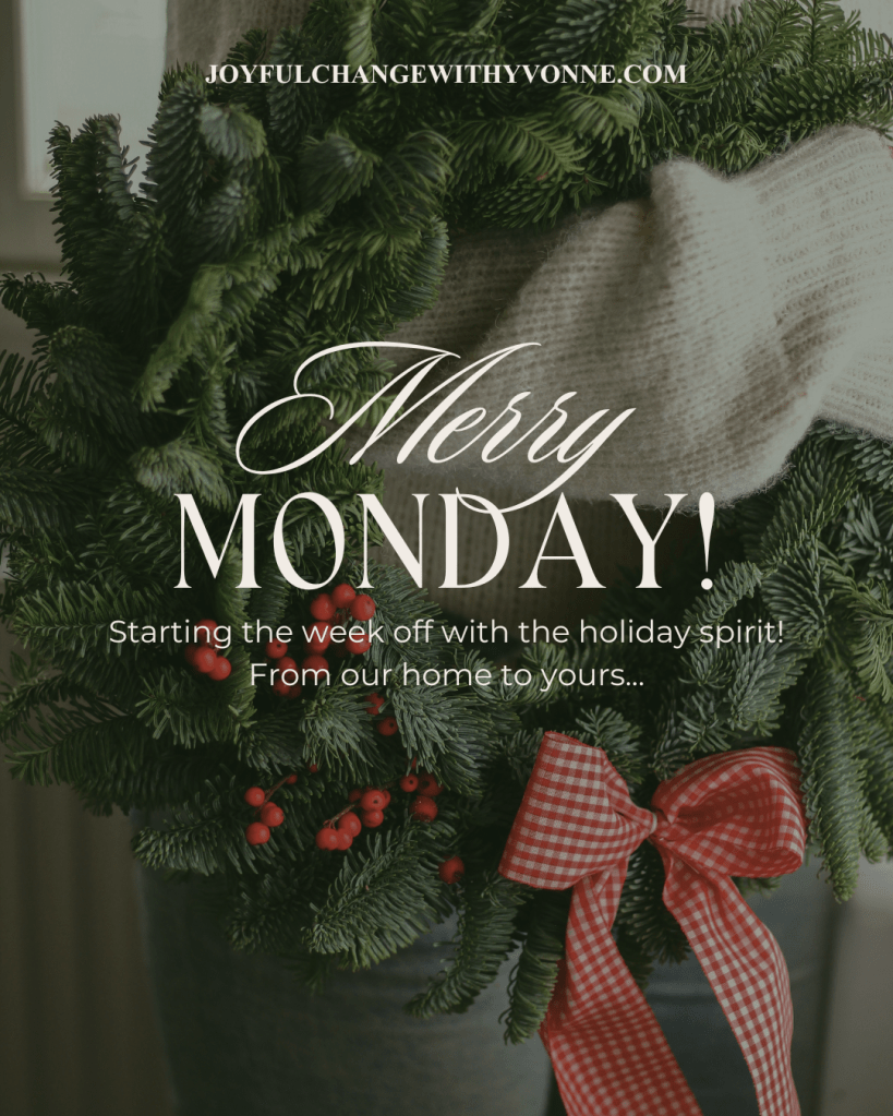 Being that we’re in the second week of December, I’m really feeling the holiday spirit…are you? I’ve got the balsam candle burning to capture that fresh Christmas tree smell and I found a radio station that plays lite Christmas music. I’m all set to start the week off right! How about you? Are you in the holiday spirit too?